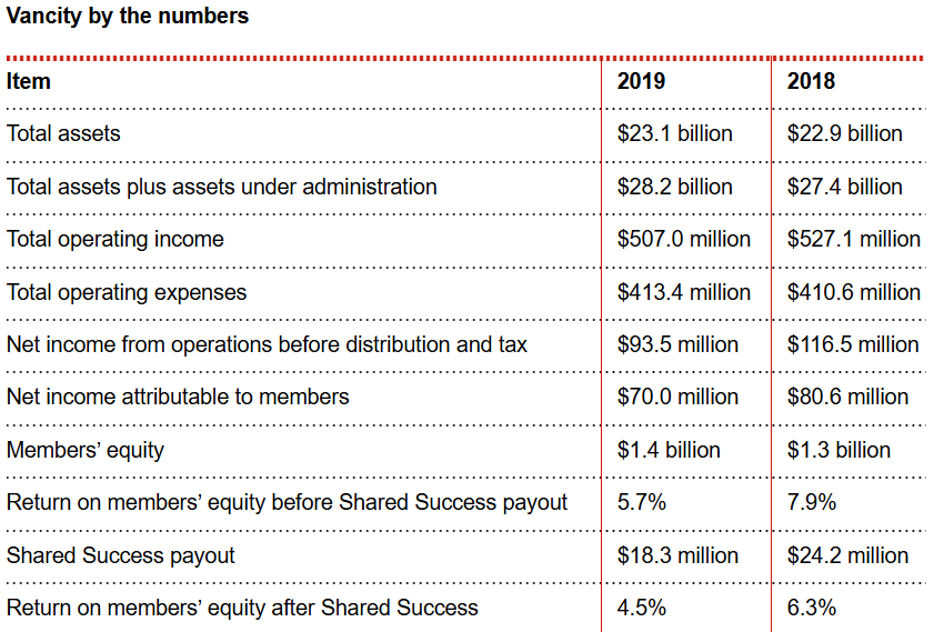 Vancity’s net results were positive overall, though lower than 2018 due to external factors beyond the credit union’s control. Income before distribution and tax in 2019 was $93.5 million.
